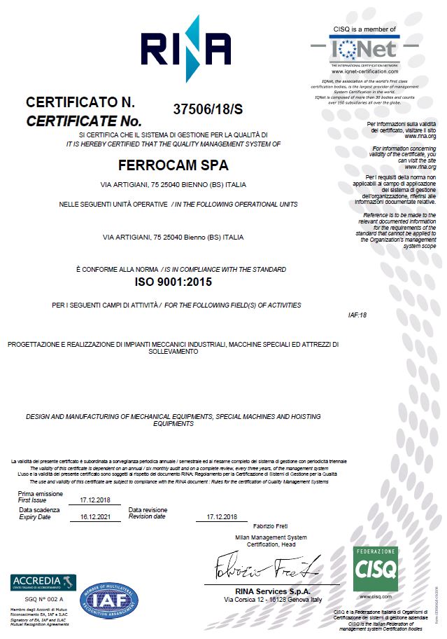 Raggiunta la certificazione di qualità ISO 9001:2015 rilasciata dal RINA.